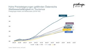 Seit 2019 sind die Preise in der österreichischen Hotellerie um rund 48 % gestiegen, bei einer allgemeinen Inflation von etwa 30 % im selben Zeitraum. Österreich liegt damit im europäischen Spitzenfeld.
